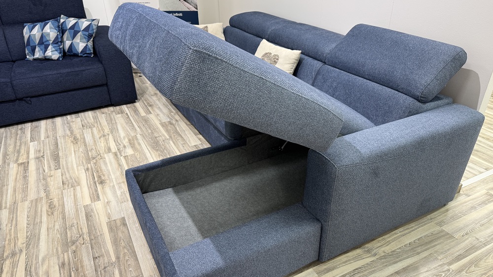 Divano versione 2 posti con chaise longue contenitore l.270 cm p.163 con poggiatesta reclyner, panchetta estraibile letto e penisola contenitore.