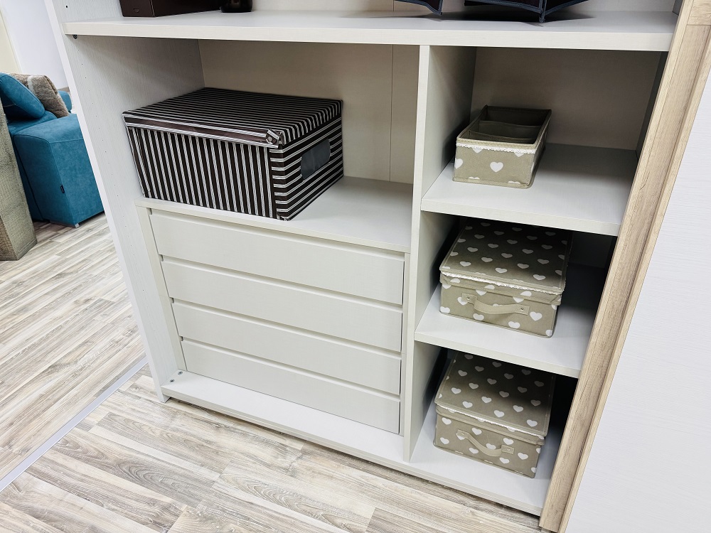 Camera completa composta da armadio 2 ante col. frassino/gesso scorrevoli con maniglia a gola e cassettiera interna a 4 casetti, 2 comodini, letto contenitore e specchiera